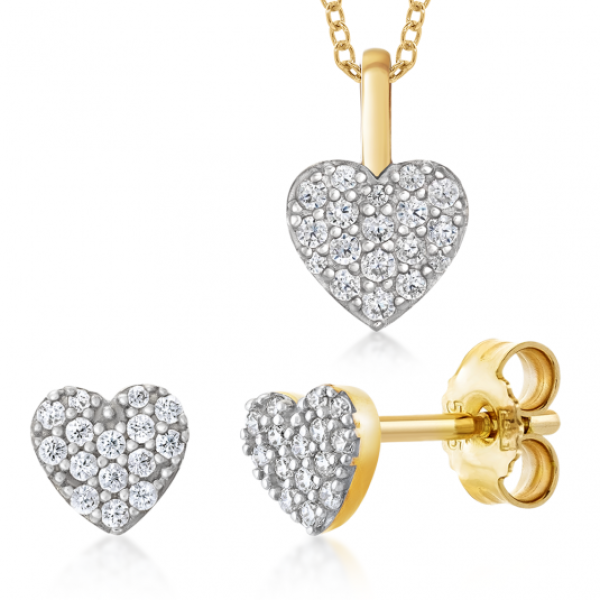 Arany medálok, medálok és szív fülbevalók átlátszó cirkóniákkal. Az ékszer 14 karátos sárga aranyból készült. A lánc nem tartozék. Medál mérete: 7 x 11,5 mm fogantyúval. Súly: 0,7 g. Fülbevaló mérete: 5,5 x 5,5 mm. Súly: 0,9 g.