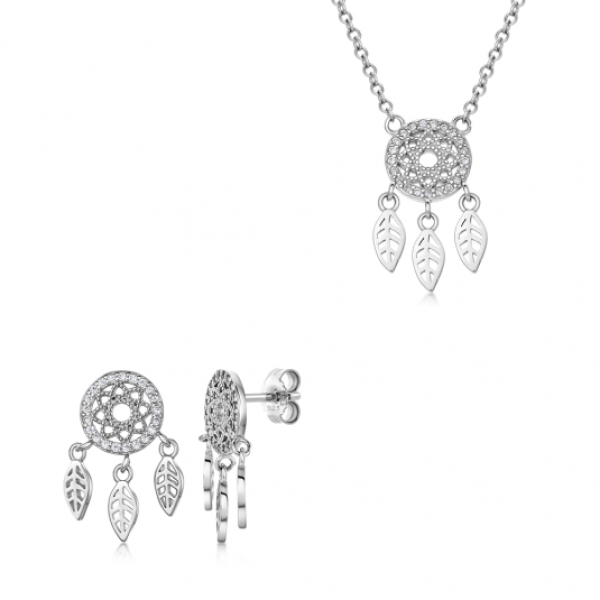 Ezüst szett, amely egy nyakláncból és egy álomfogó formájú fülbevalóból áll. Nyaklánc hossza: 45 cm, 42, 40 és 38 cm-nél zárható. A díszítő rész méretei: 9,5 x 19 mm. Súly: 3 g. A fülbevaló mérete: 9,5 x 19 mm. Súly: 2 g.