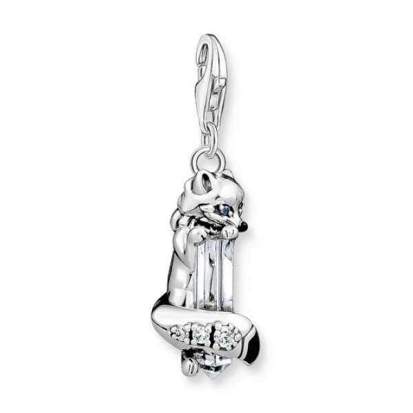 Ezüst medál "Fox" - a csiszolt kvarchoz simuló sarki róka átlátszó cirkóniákkal van díszítve, a róka szemeit pedig kék szintetikus spinellek díszítik. A medál karabineres zárral rendelkezik, és a Charm Club kollekció ékszereihez alkalmas. Méretek: 8,00 x 31,00 mm.