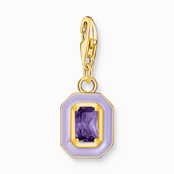 Ezüst charm medál "Octagon" lila tűzzománccal és cirkóniával. A medál 18 karátos sárga arannyal van futtatva. A medál karabineres zárral rendelkezik, és a Charm Club kollekció ékszereihez alkalmas. Medál mérete: 9 x 24 mm karabinerrel.