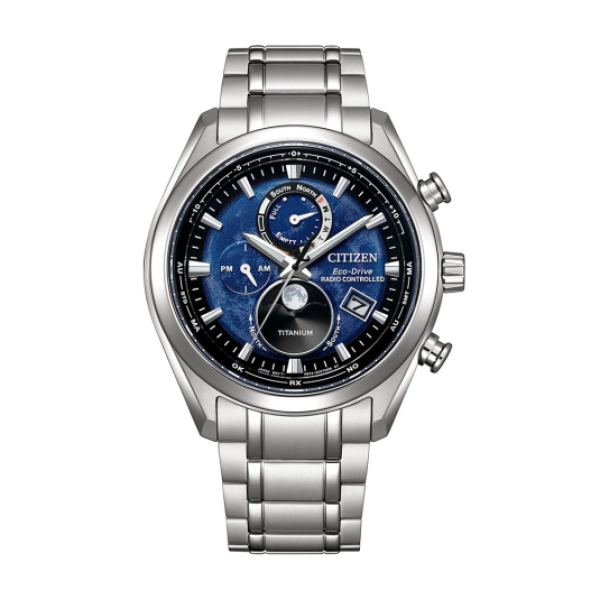 Citizen Tsukiyomi Moonphase Eco-Drive férfi karóra "rádióvezérlésű" rendszerrel ( elektronikus eszközök felületbeállításának rendszere precíz időre 1 másodperces eltéréssel millió évenként). Számlap: analóg Számlap anyaga: titán Számlap átmérő: 43 mm Óraüveg_ zafír Vízállóság_ 10 ATM (úszás és snorkeling) Szíj: titán Órahajtás: eco-drive (a meghajtó természetes és mesterséges fényt biztosít, nem kell elemet cserélni) Funkciók: holdfázisok, világidõk, automatikus naptár, mágneses ellenállás, akkumulátor állapotellenõrzés