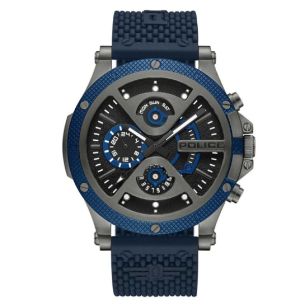 Police Surigao férfi karóra. Számlap: analóg Számlap anyaga: acél Számlap átmérő: 47 mm Óraüveg_ ásványi Vízállóság_ 5 ATM (zuhany) Szíj: kék szilikon Órameghajtó: akkumulátor Óraszerkezet: kvarc analóg