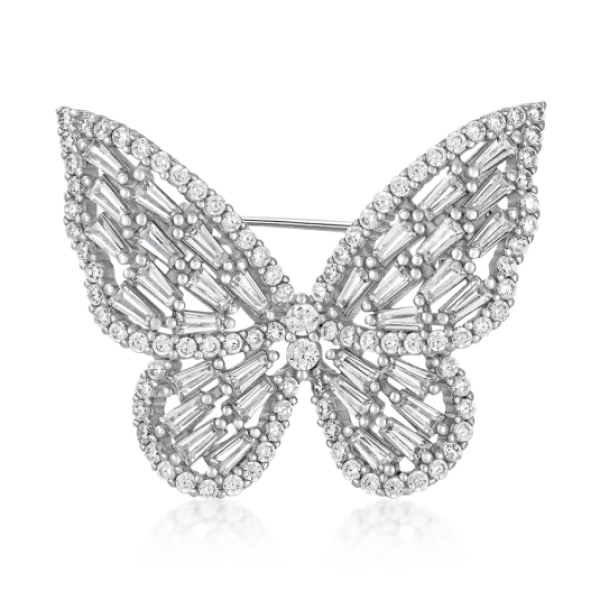 Elegáns női pillangós bross átlátszó cirkóniákkal. Bross méretei: 31 x 25 mm. Súly: 6 g.