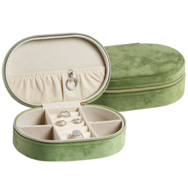 Az elegáns ovális alakú ékszerdoboz puha, szürke árnyalatú bársony anyaggal van bevonva, és fém cipzárral záródik. A belső rész puha bézs velúrral bélelt és praktikus rekeszekre van osztva - ideális gyűrűk, fülbevalók vagy kisebb medálok tárolására. Kompakt méretének köszönhetően nagyszerűen használható utazáshoz, mivel ékszereit rendezetten és védve tartja a sérülésektől. Ékszerdoboz méretei: 150 x 100 x 50 mm. A képen látható ékszer nem része az ékszerdoboznak, csak illusztráció.